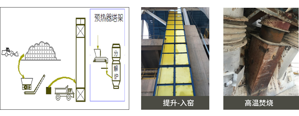 經拆包、分揀、破碎后,用廠內專用危險廢物運輸車輛(密閉形式),轉運至窯尾固態(tài)廢物處置線提升機,經提升機提升至窯尾平臺,再經皮帶機、鎖風等裝置投入窯尾煙室,實現(xiàn)高溫焚燒處置。