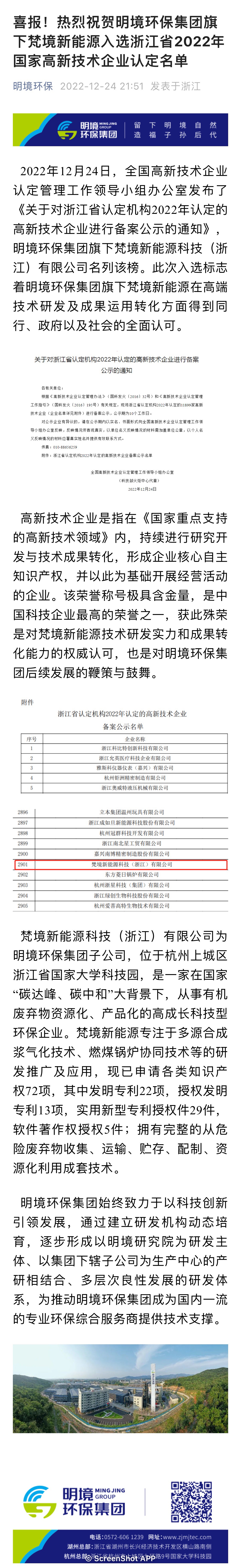 喜報!熱烈祝賀明境環(huán)保集團旗下梵境新能源入選浙江省2022年國家高新技術(shù)企業(yè)認(rèn)定名單